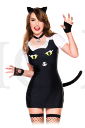 Purrrrfect your kitty costume with this Kitty Costume Accessory Kit featuring black cat ear headband, black choker necklace with bell embellishment, black cat tail, and black fishnet fingerless gloves. (Cat dress and stockings not included.)