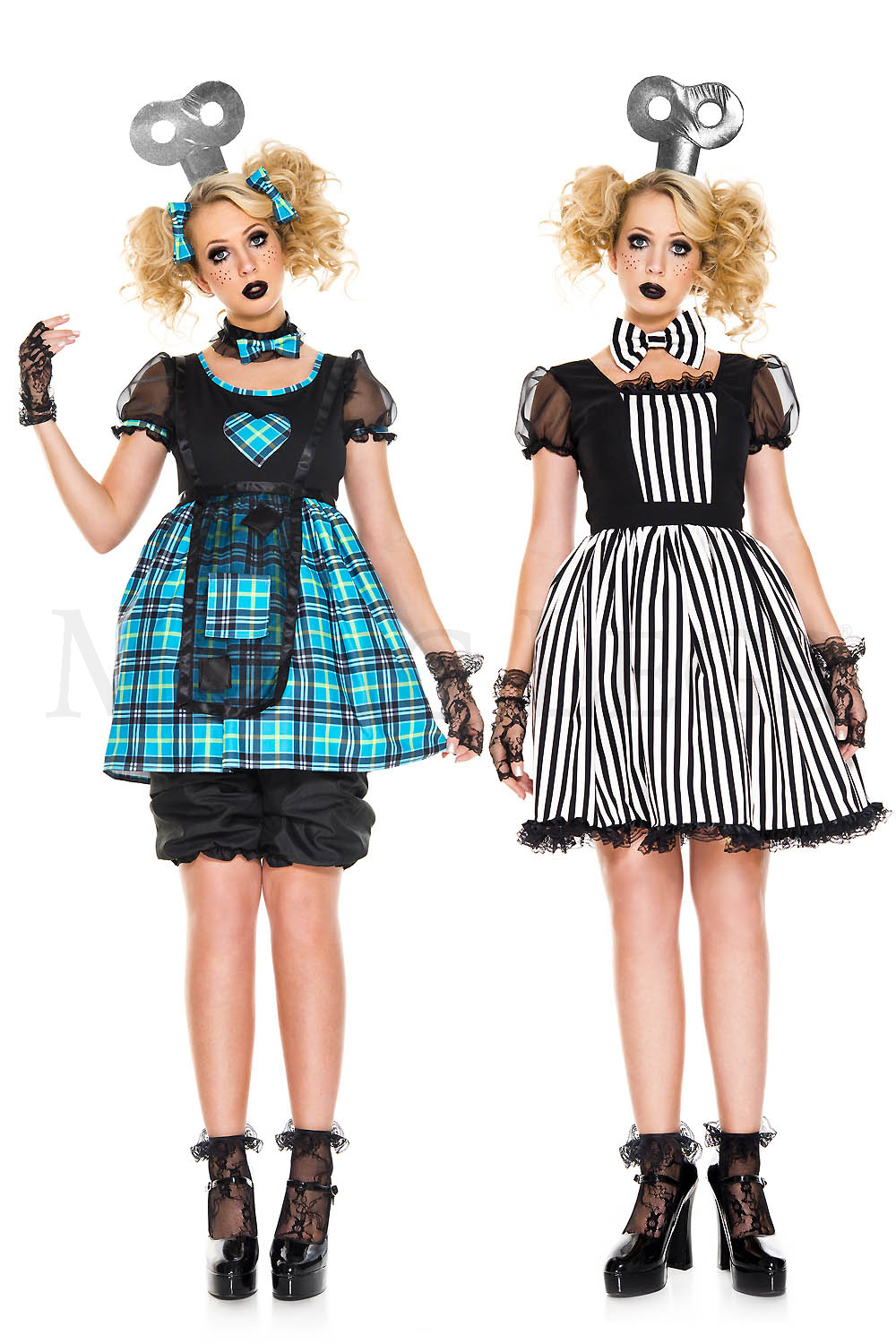 5 PC. includes: Checker with mesh rag doll dress with bloomer shorts, wind-up headpiece, hair clips and choker