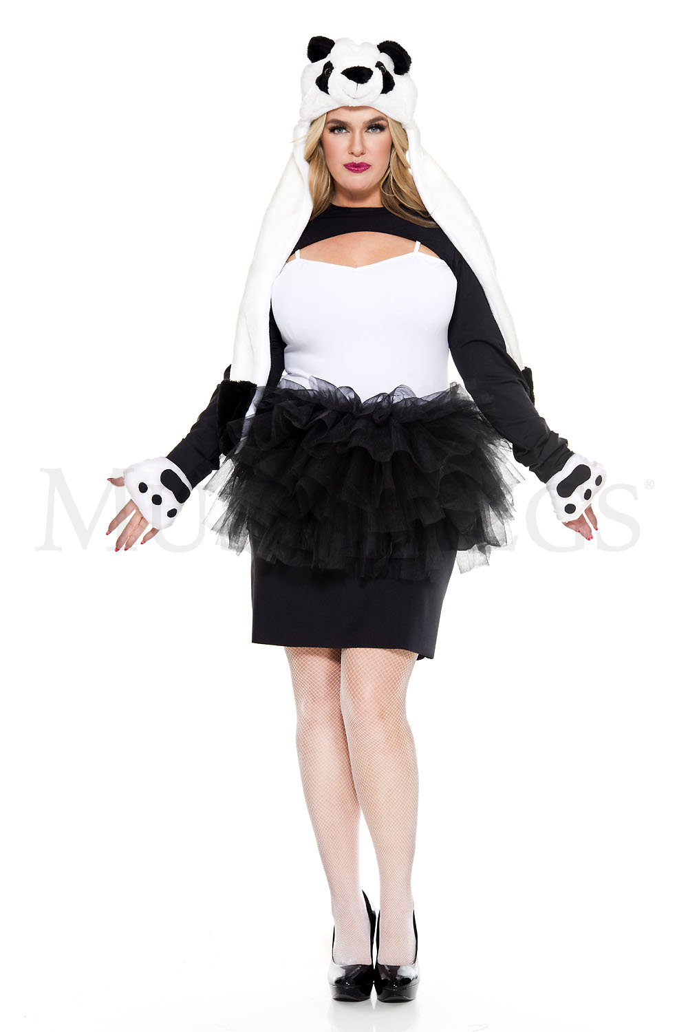 Lounge around in this plus size Panda Cutie costume featuring black and white dress with long sleeves, a cut-out neckline, a black tutu skirt, white fingerless gloves with black paw print detailing, and a fuzzy panda hat.