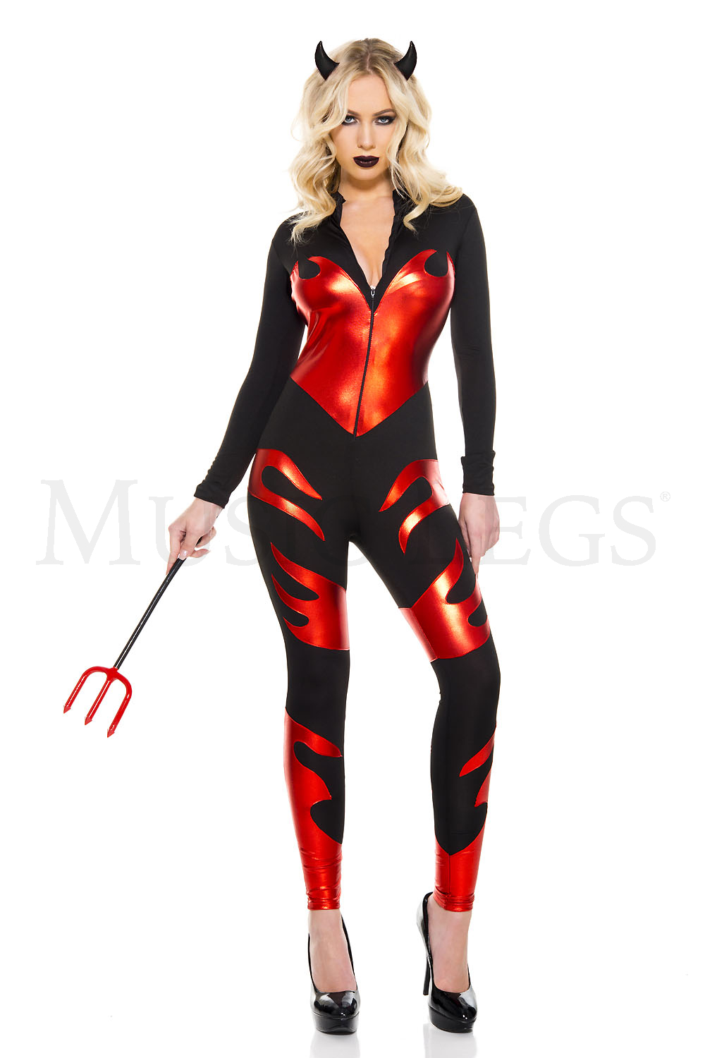 Turn up the heat in this Sizzling Devil costume featuring a black jumpsuit with long sleeves, a front zipper closure, red flame detailing, a black horn headband, and a toy pitchfork.