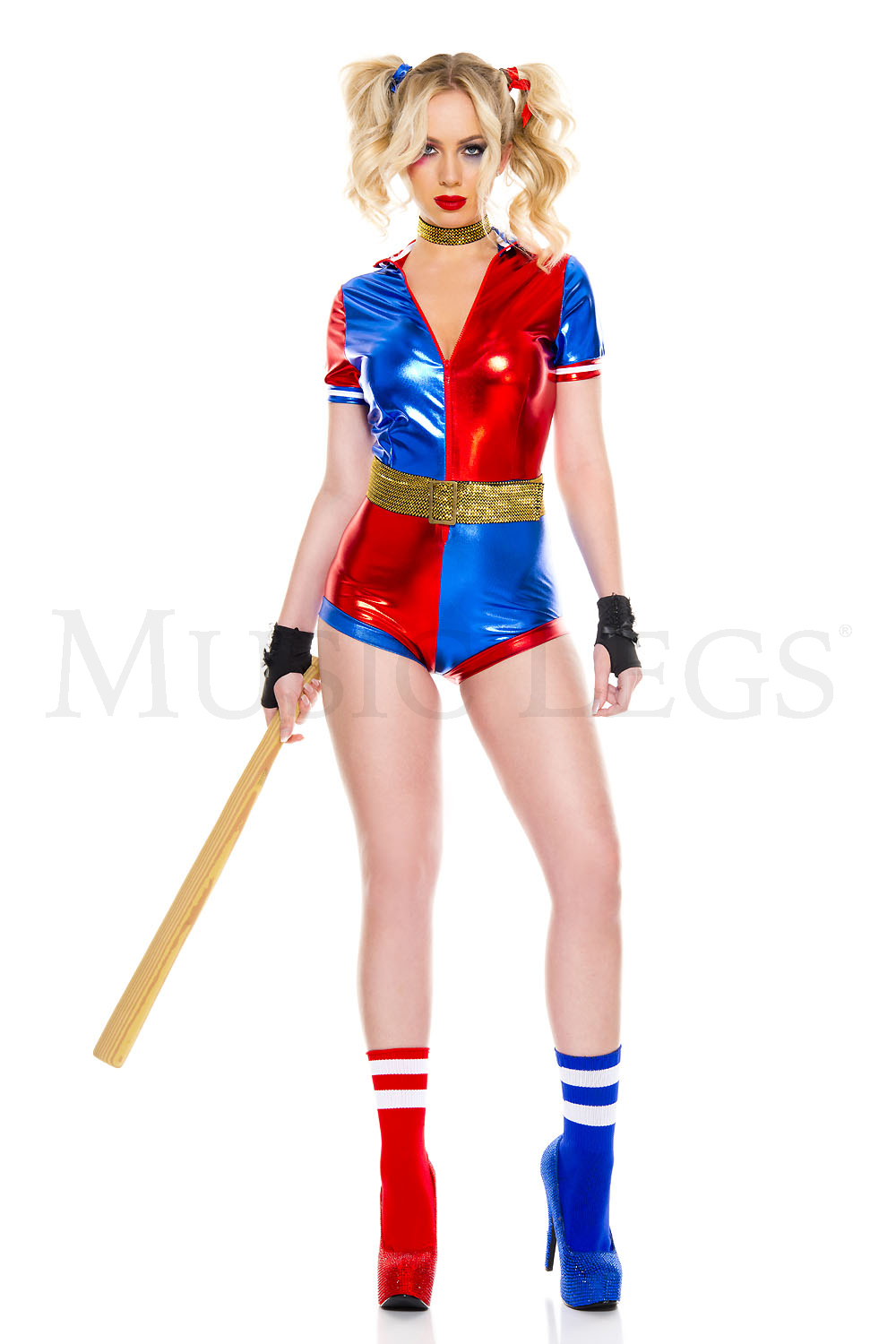 Take down the good guys in this No Good Harley Jester costume featuring a blue and red wet look romper with short sleeves, a front zipper closure, a gold belt, a gold choker, black fingerless gloves, red and blue hair ties, and matching striped ankle socks. (Bat not included.)