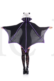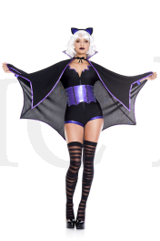 Flit through the night sky unseen in this Gothic Bat costume featuring a black romper with a jagged, purple neckline, a front zipper closure, long sleeves with purple cuffs, a purple waist cincher with black piping details, a matching bat cape with a tie closure, and a matching ear headband. (Thigh high stockings and wig not included.)