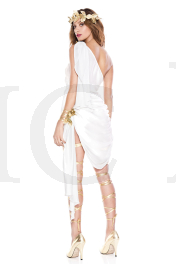 4 Pc. includes: White high-low dress with one shoulder strap and drape white fabric, gold leaf wrist bands, fold leag headpiece, and leg wraps.