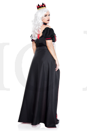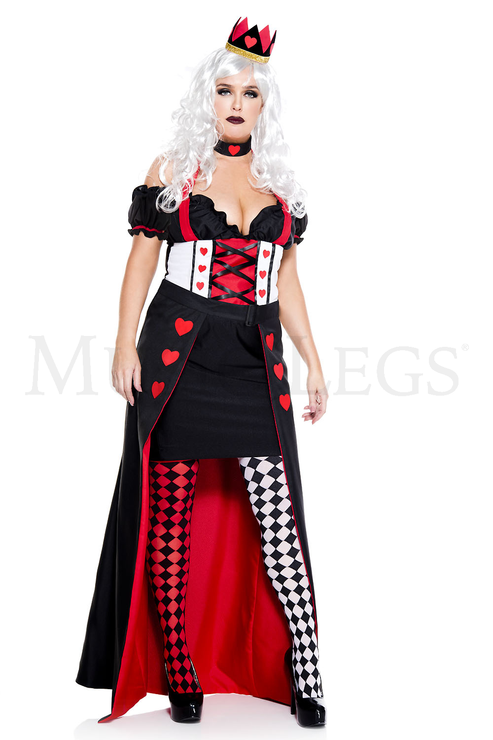 5 PC. includes: Plus size off the shoulder dress with lace up and heart details, detachable train, heart details crown, choker, and thigh hi