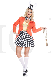 5 PC. Includes: Plus size yellow button tio, gold detail long tail coat, checker print skirt, ears/hat headpiece, and bow choker