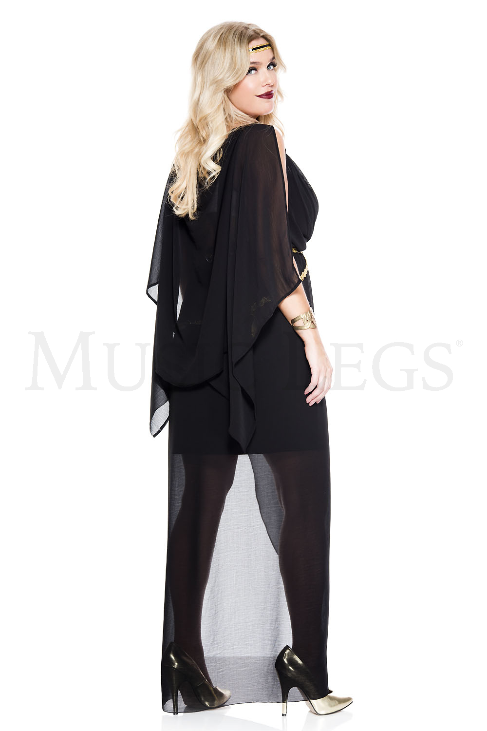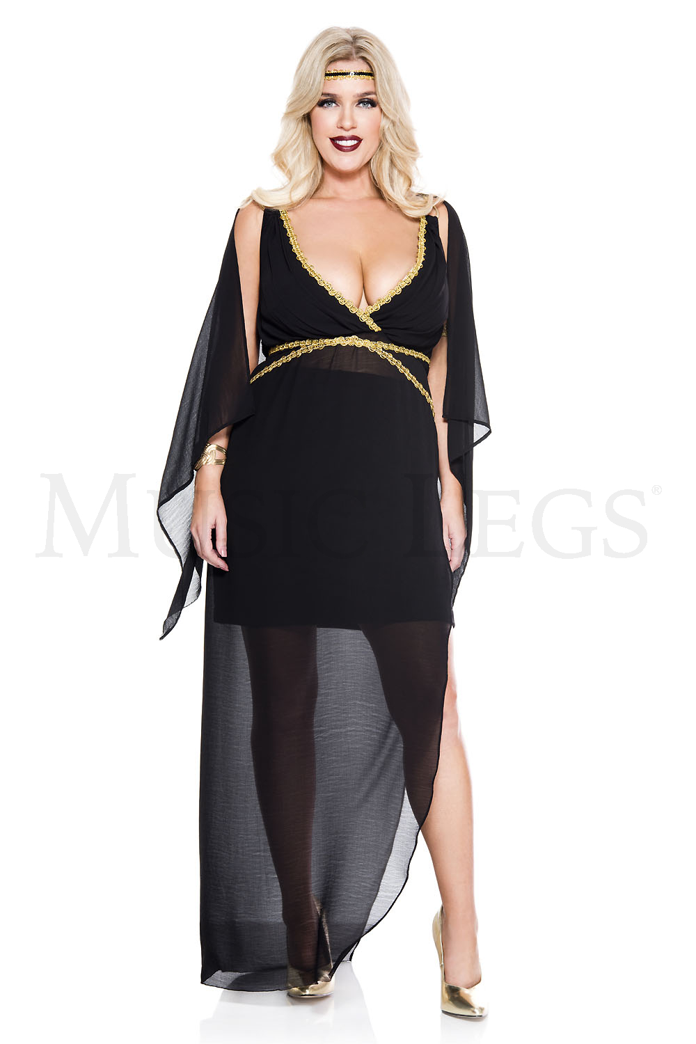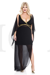 2 PC. includes: Gold trim sheer asymmetrical dress with attached draped black fabric and goddess headband