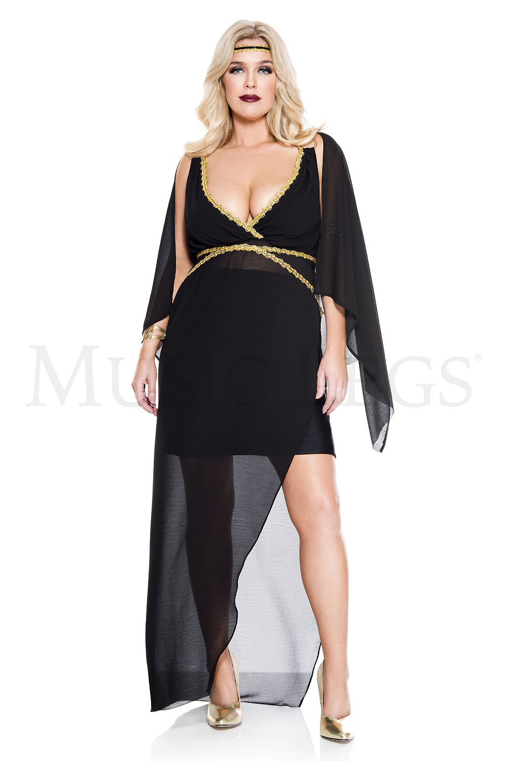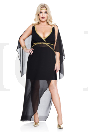 2 PC. includes: Gold trim sheer asymmetrical dress with attached draped black fabric and goddess headband