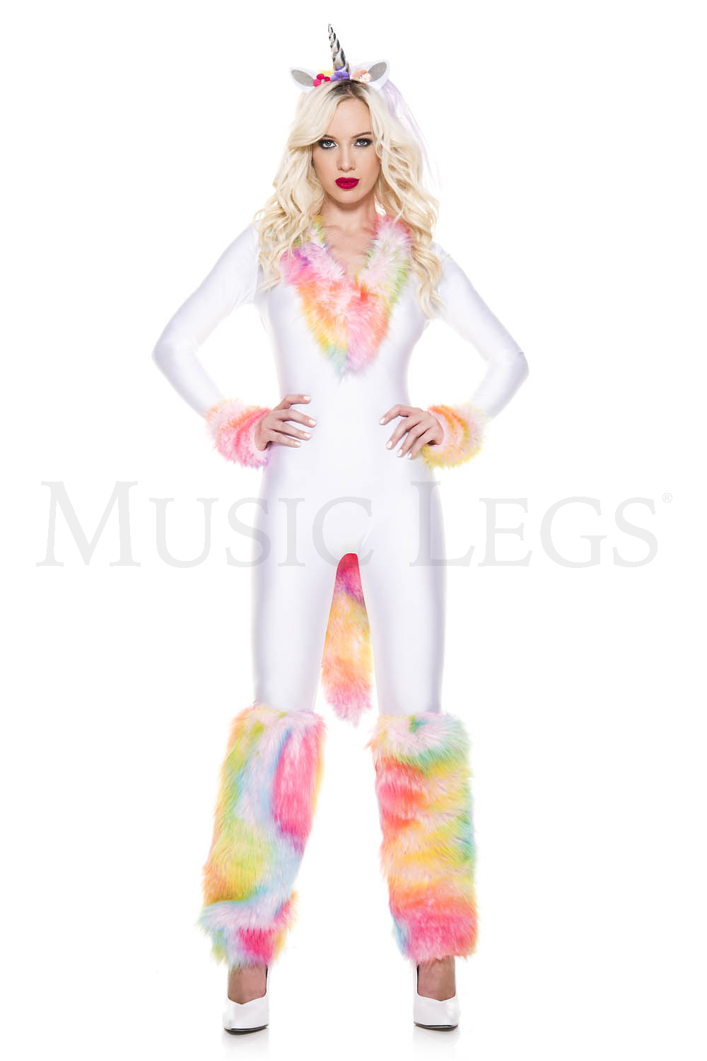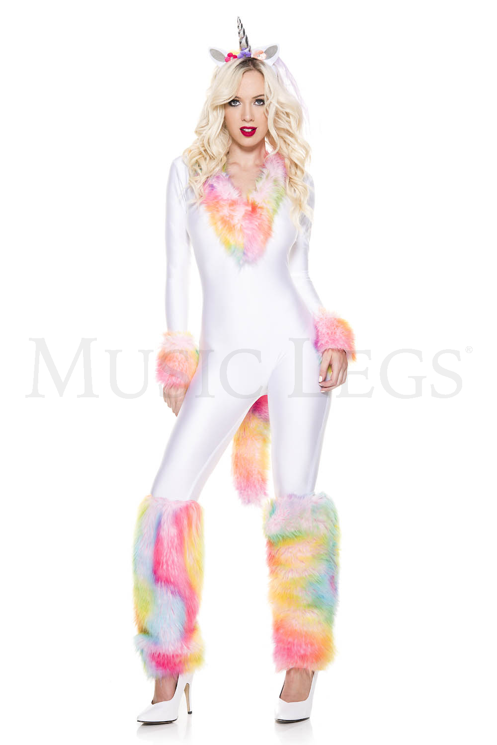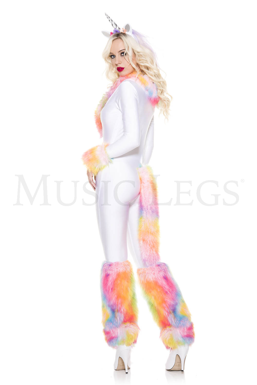 NEW! 4 PC. includes: White catsuit with faux fur trim, faux fur rainbow tail, silver horn headband, and rainbow leg warmers