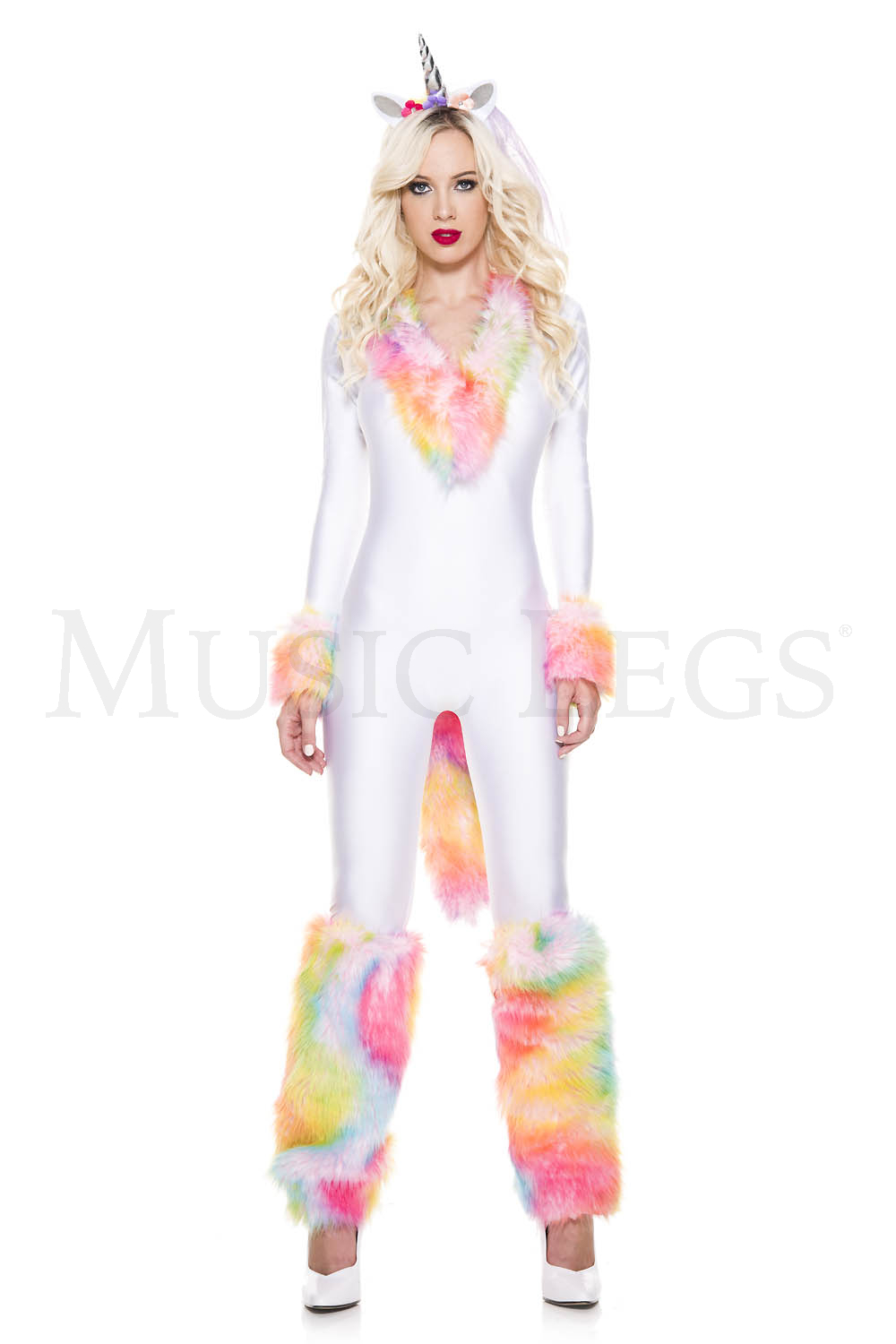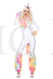 NEW! 4 PC. includes: White catsuit with faux fur trim, faux fur rainbow tail, silver horn headband, and rainbow leg warmers