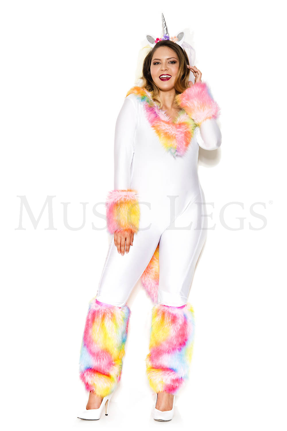 4 PC. includes: Plus size white catsuit with faux fur trim, faux fur rainbow tail, silver horn headband, and rainbow leg warmers