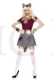NEW! 5 PC. includes: Checker print top with attached faux fur tail, ripped skirt, wolf ears headband, wrist cuffs, and thigh hi