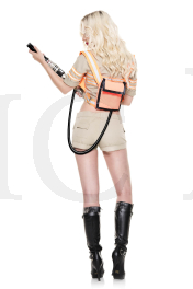 4 PC. includes: Short sleeve crop top, beige shorts, matching choker, and backpack with toy weapon
