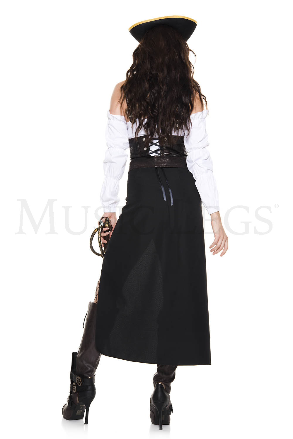 5 PC. includes: One side high slit dress, puffed sleeves, lace up cincher, belt, and hat
