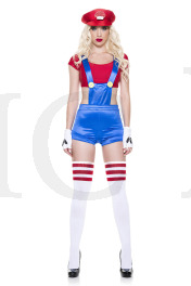 4 PC. Includes: Satin look short overalls, short sleeve crop top, hat with mushroom applique, and fingerless gloves