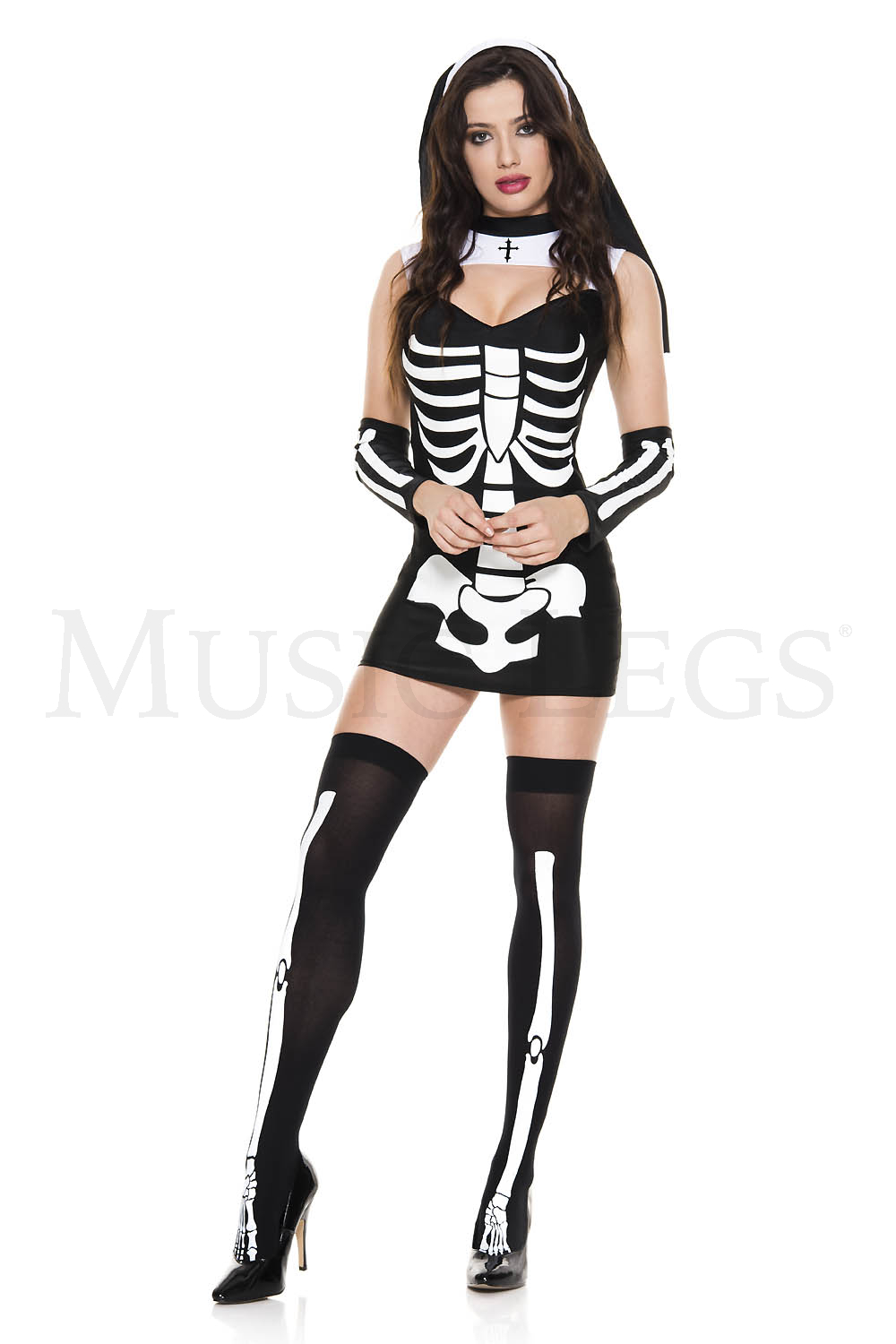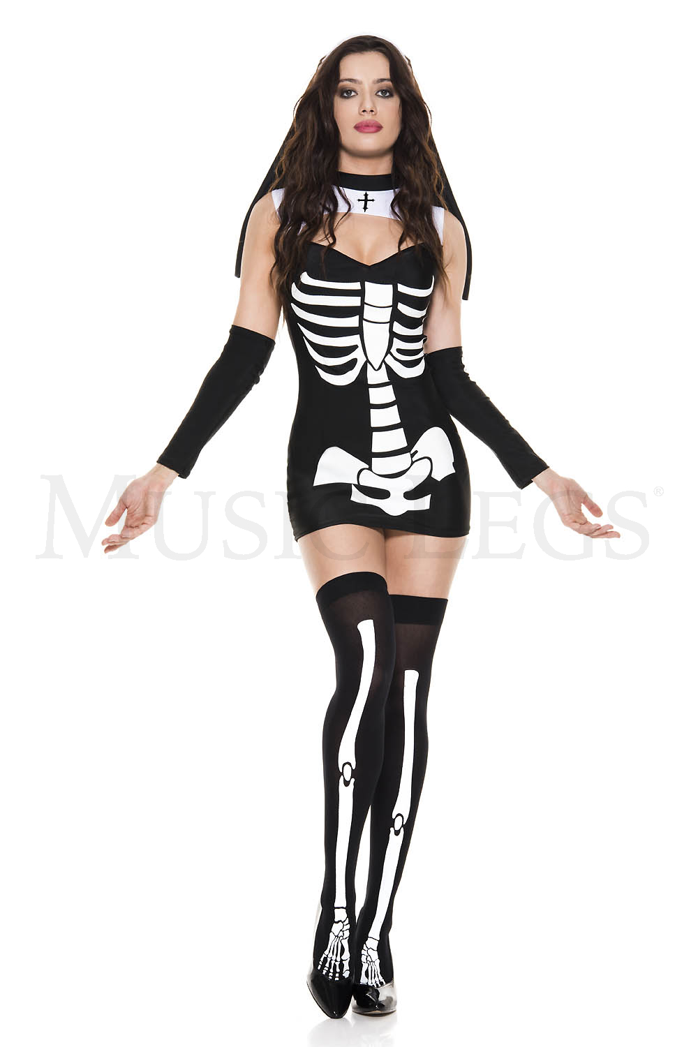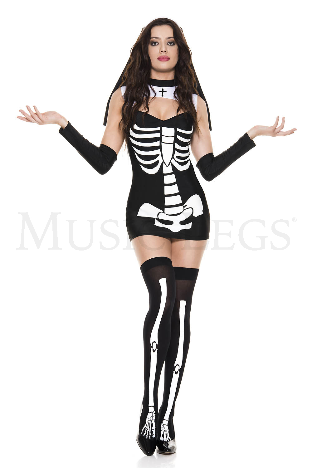 NEW! 4 PC. includes: Skeleton print dress, habit, matching arm warmers, and skeleton print stockings