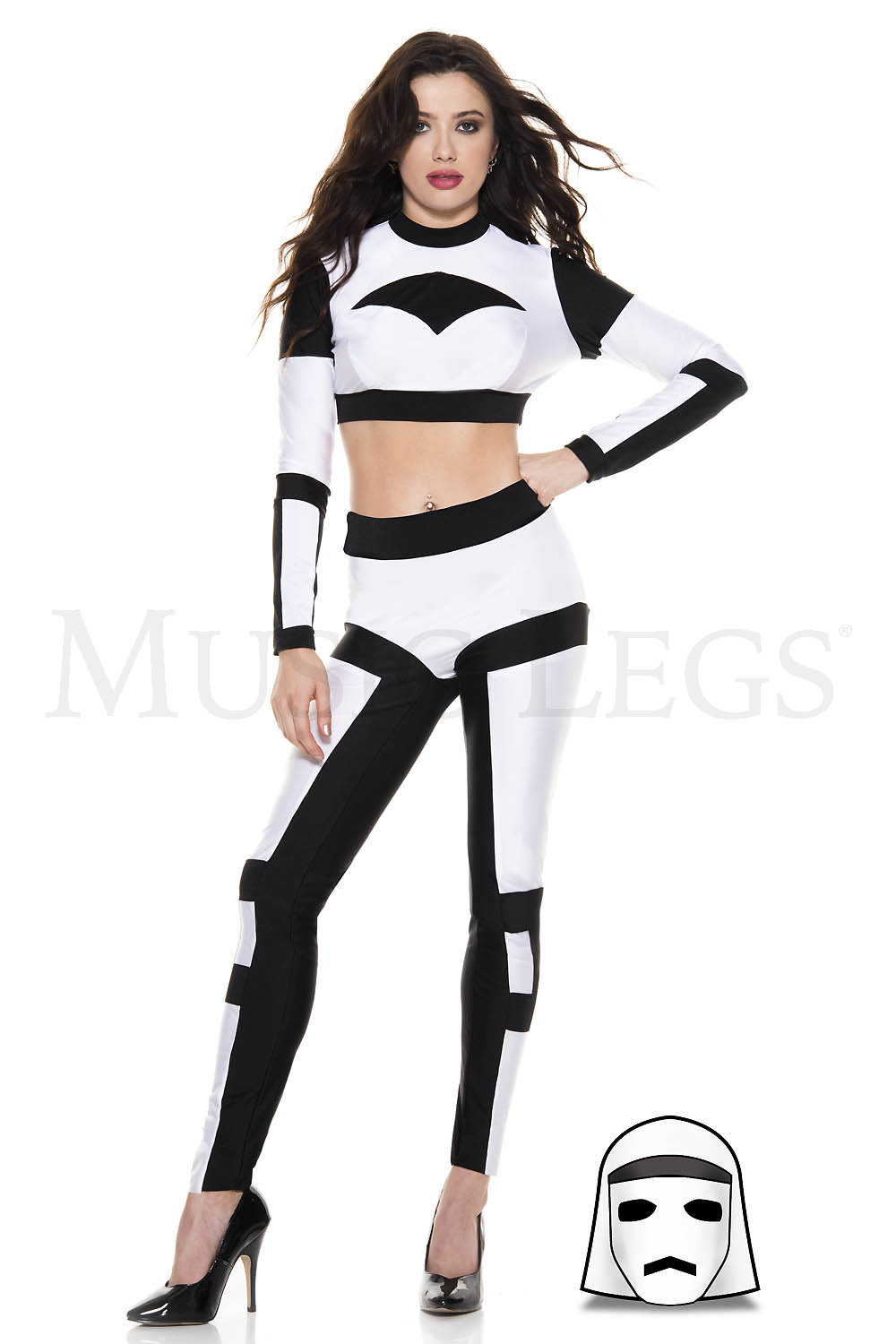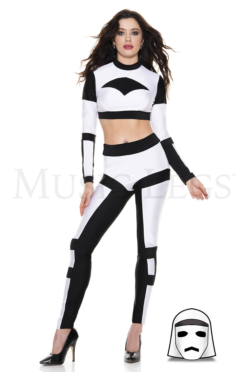 4 PC. includes: Silver wet look bodysuit with heart applique, matching arm warmers, hat, and choker