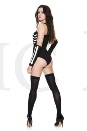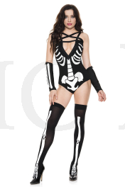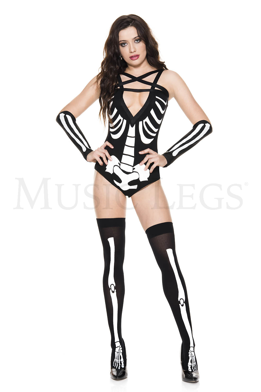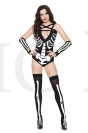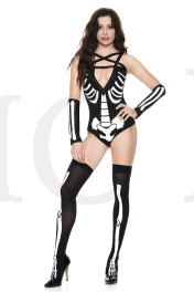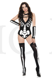 NEW! 3 PC. includes: Skeleton print teddy with strappy front, matching arm warmers, and thigh hi