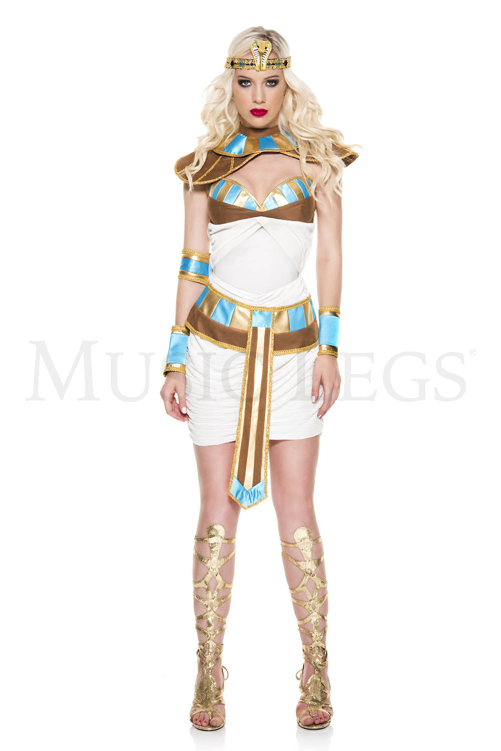 NEW! 6 PC. includes: White ruched dress with bust detailing, snake shape headband, collar, belt, wrist cuffs, and arm band