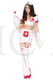 NEW! 6 PC. includes: Pocket cross print crop top, skirt with attached cross apron, nurse headband, stethoscope, gloves, and thigh hi