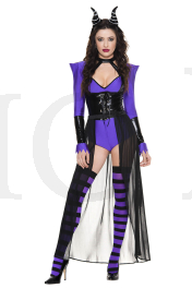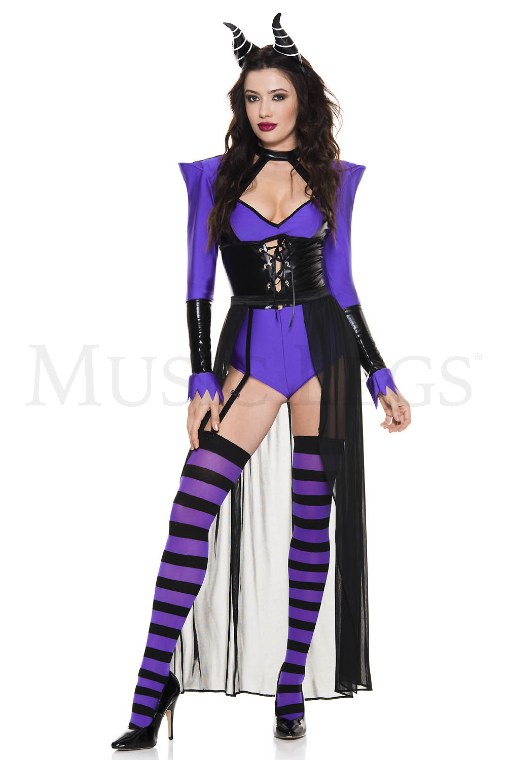 NEW! 4 PC. includes: Purple romper, lace up wet look cincher, sheer train, and horns headband
