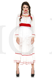 3 PC. includes: Lace trim dress with built in red belt, hair ties, and ruffle trim choker