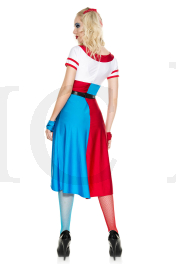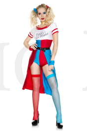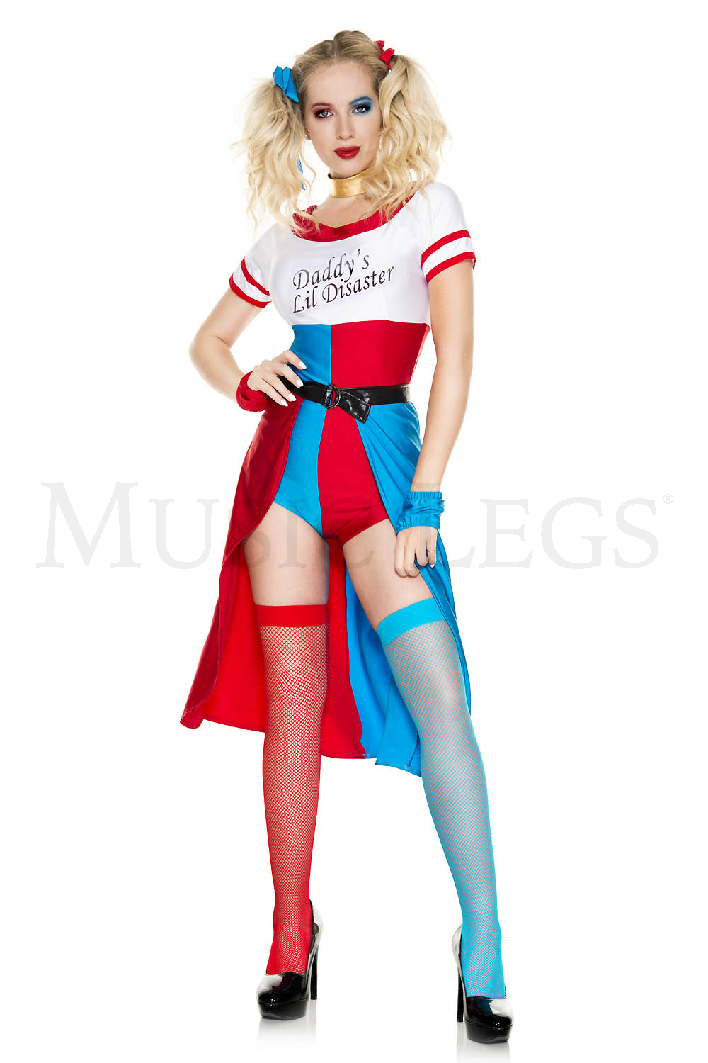 6 PC. includes: Blue and red jester romper with imprint, detachable open front skirt, hair ties, choker, gloves, and thigh hi