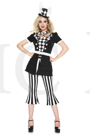 4 PC. includes: Multi layer checker print top with built in belt, striped pants, Rabbit ears hat, and bow choker
