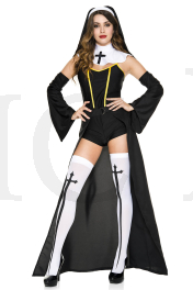 6 PC. includes: Gold lining romper, detachable train, shoulder cape with cross imprint, habit, flare bell sleeves, and thigh hi
