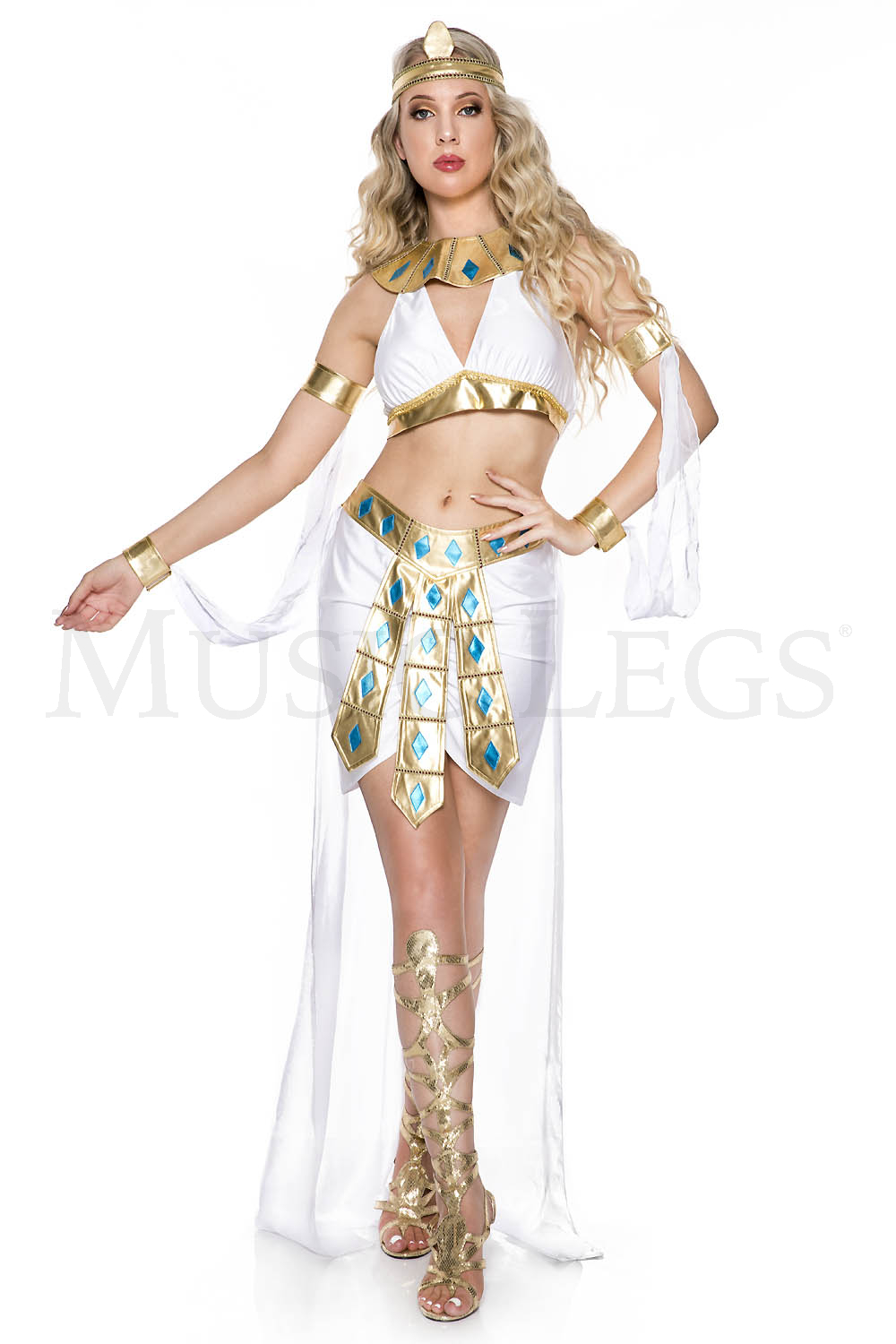 5 PC. includes: White and gold top, skirt with attached drape and built in belt with hanging panels, gold neckpiece with turquoise embellishment, headband, and arm drapes with cuffs