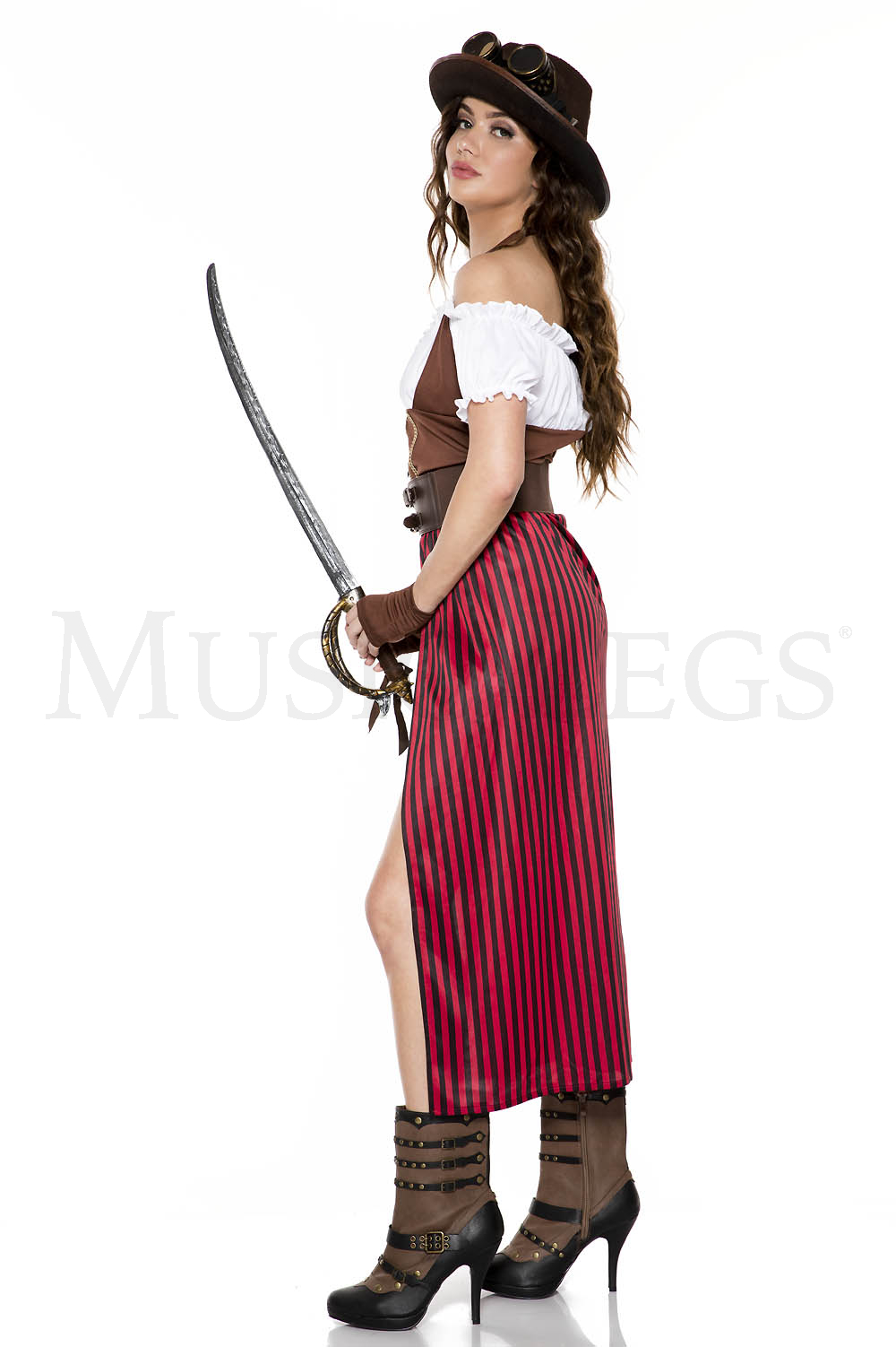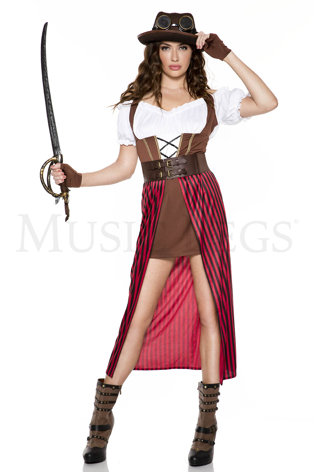 5 PC. includes: Off the shoulder lace up dress with attached stripes train, waist cincher, hat, goggles, and fingerless gloves