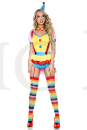3 PC. includes: Multicolor skirt romper with attached suspenders, bow choker, and clown hat