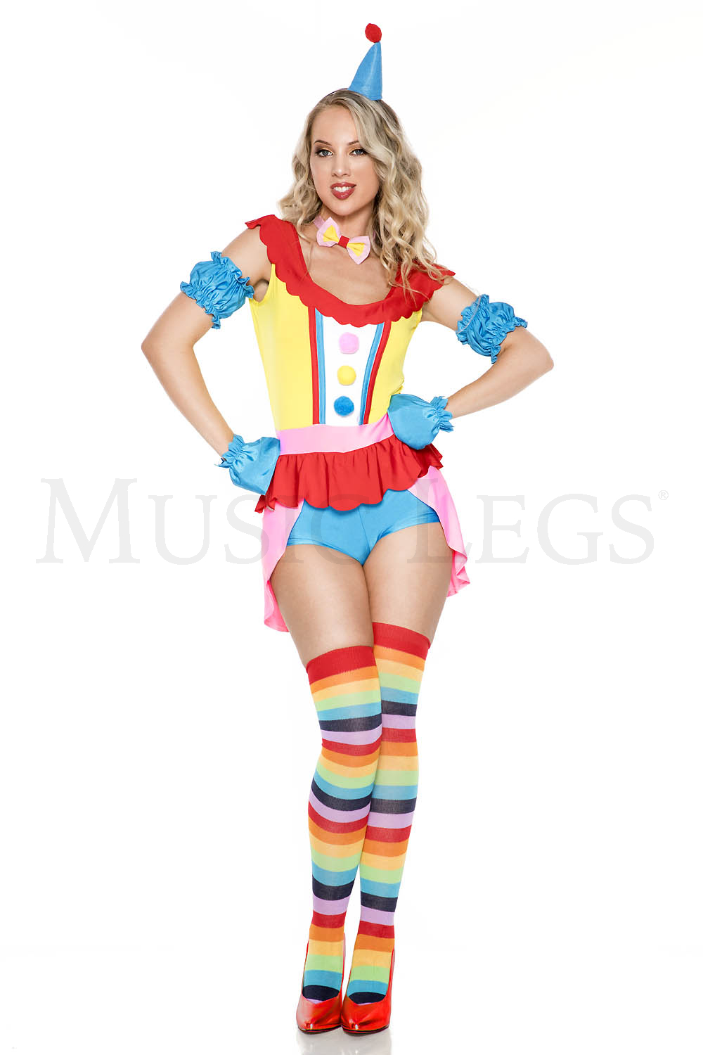 5 PC. includes: Multicolor skirt romper with pom pom accents, clown hat, arm bands, and gloves