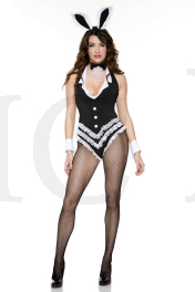 4 PC. includes: Black teddy with white ruffle details, bow choker with attached tulle, ears headband, and wrist cuffs (Stockings and gloves not included)