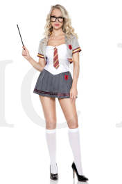 4 PC. includes: Pleated strapless skirt dress with attached tie, short sleeve jacket, glasses, and wand