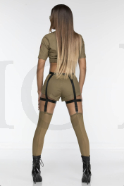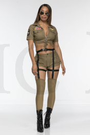 4 PC. includes: Front tie short sleeve crop top with badge accents, zipper shorts, removable garter belt with wrap around leg garters, and thigh hi