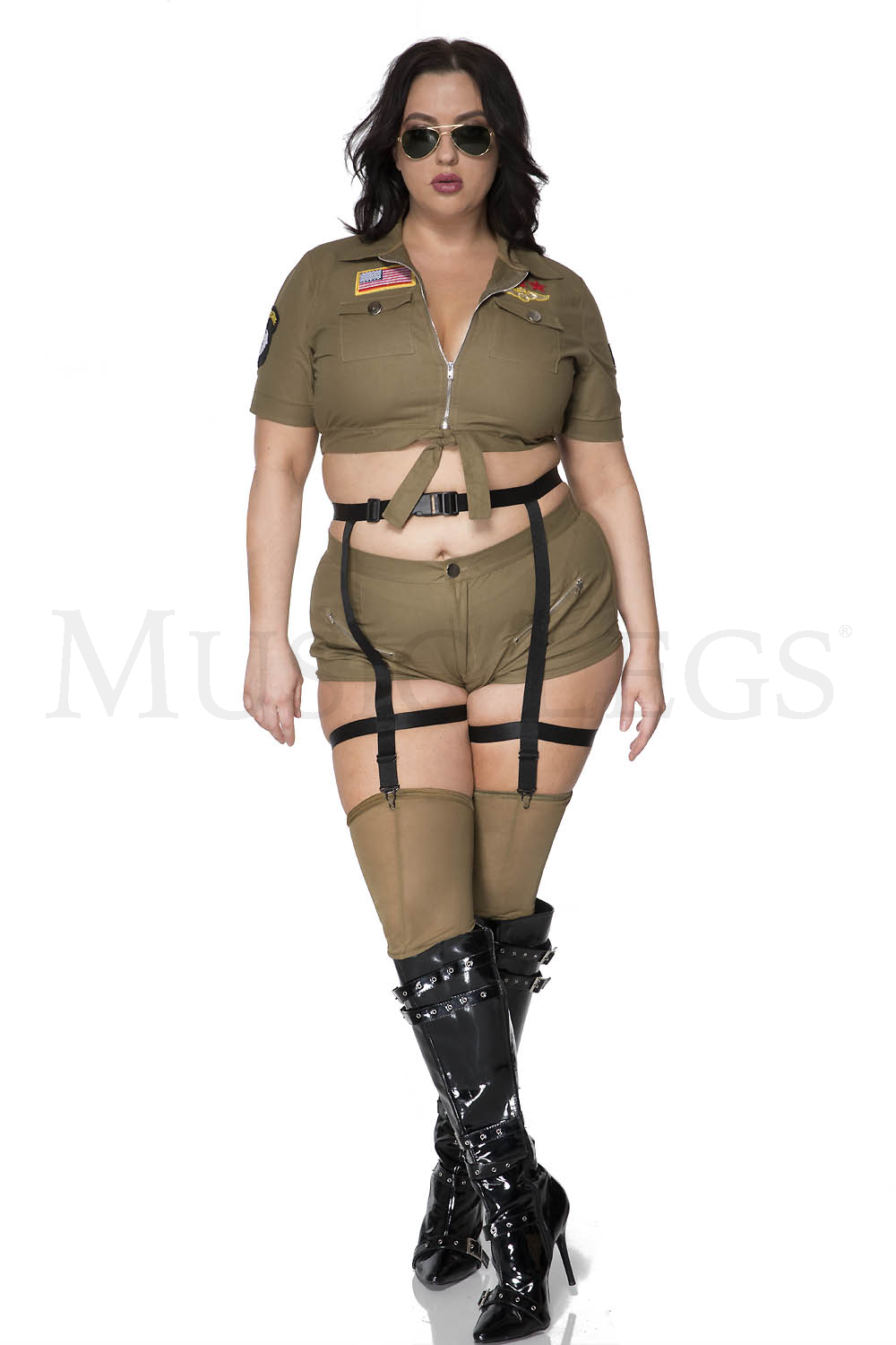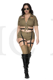 4 PC. includes: Plus size front tie short sleeve crop top with badge accents, zipper shorts, removable garter belt with wrap around leg garters, and thigh hi
