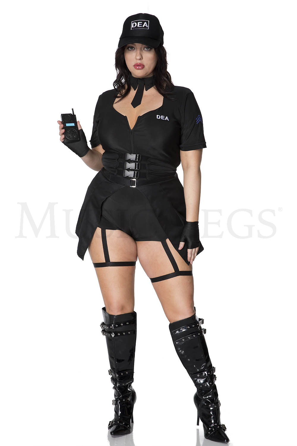 6 PC. includes: Plus size short sleeve romper with badge accents and attached wrap around leg garters, front buckle accents A-line skirt, DEA hat, collar tie, g