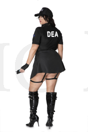 6 PC. includes: Plus size short sleeve romper with badge accents and attached wrap around leg garters, front buckle accents A-line skirt, DEA hat, collar tie, g