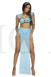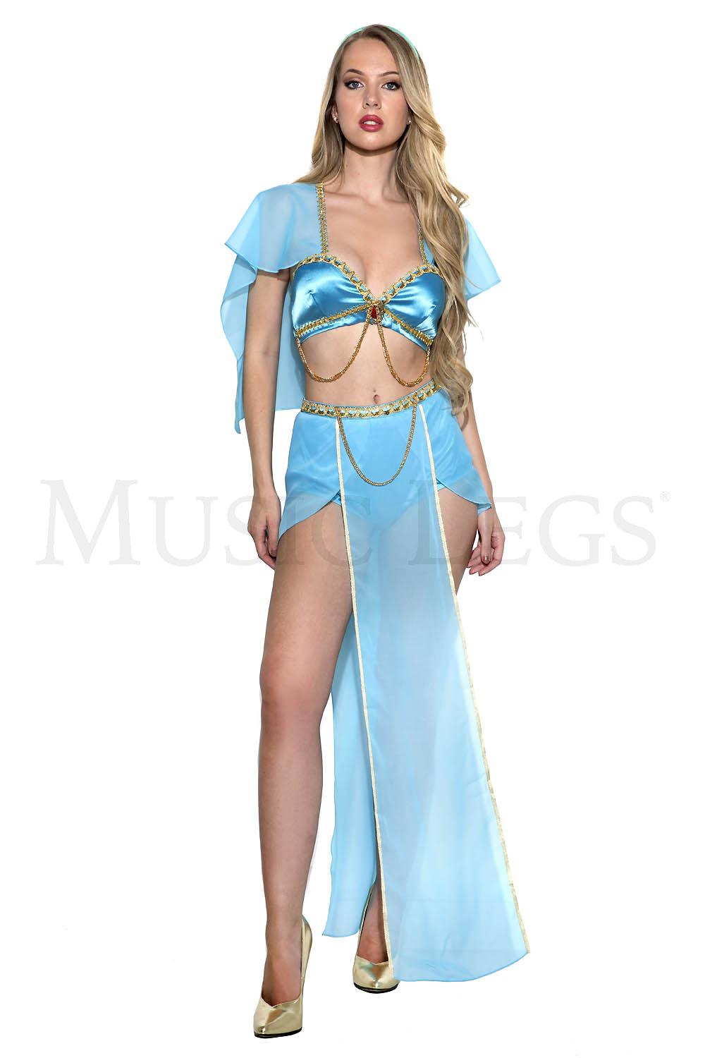 3 PC. includes: Two tone high slits dress with gold trim, top with sheer flare sleeves, and headband