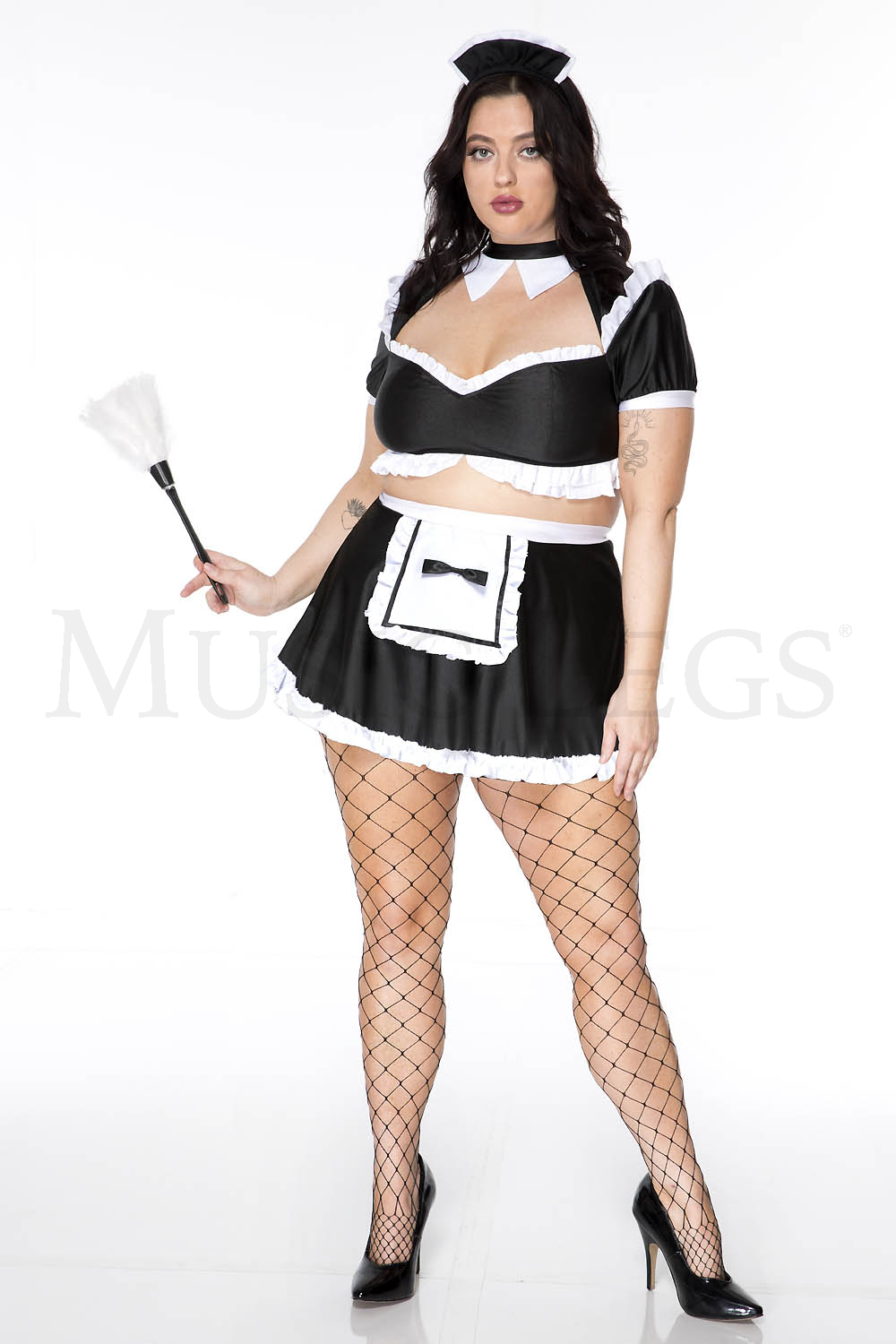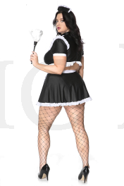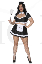 4 PC. includes: Plus Size Lace trimming, a lace-up front with choker, attached apron and the lacy skirt, feather duster, and headpiece