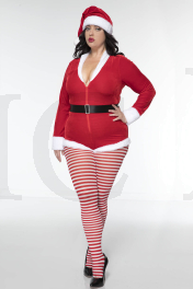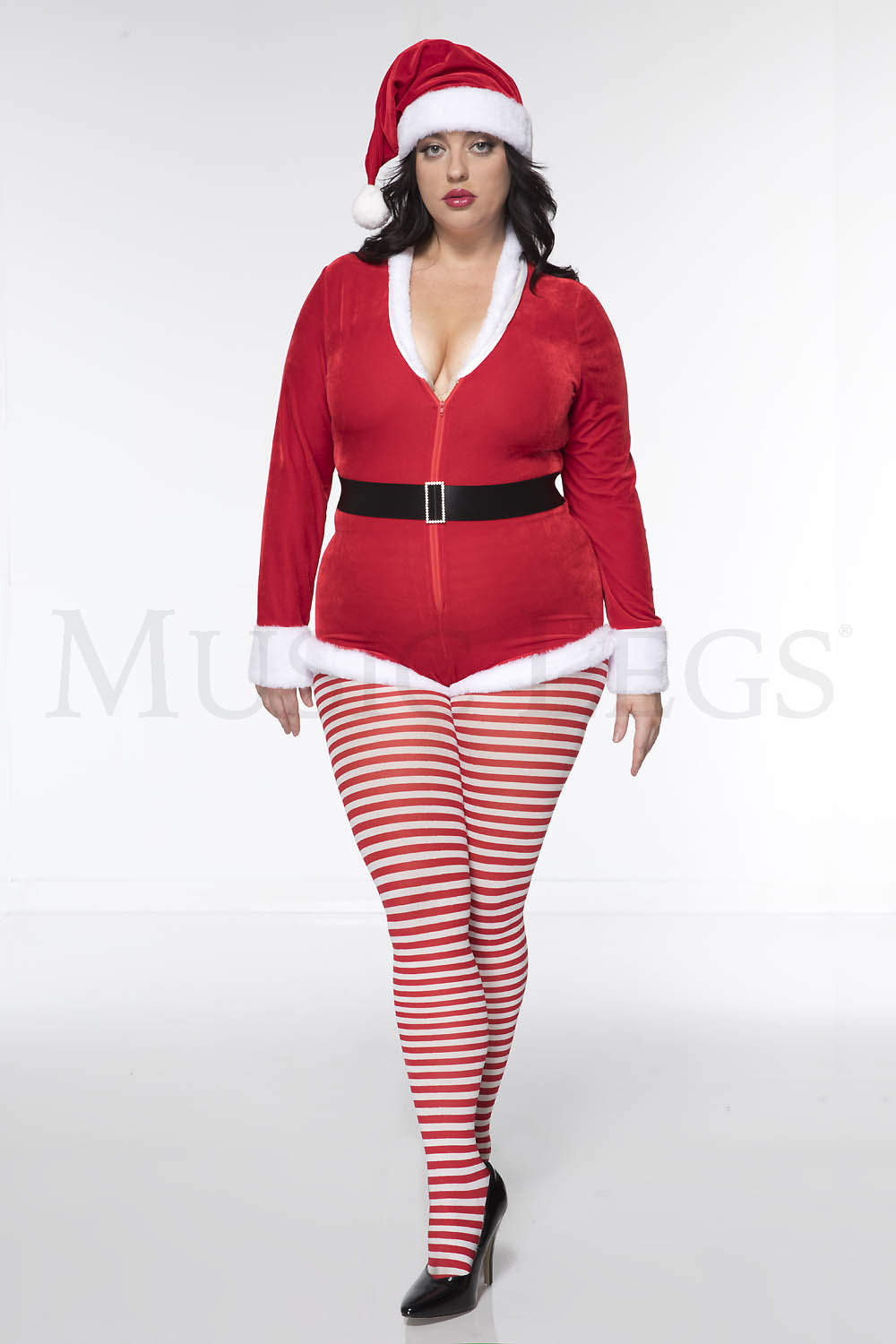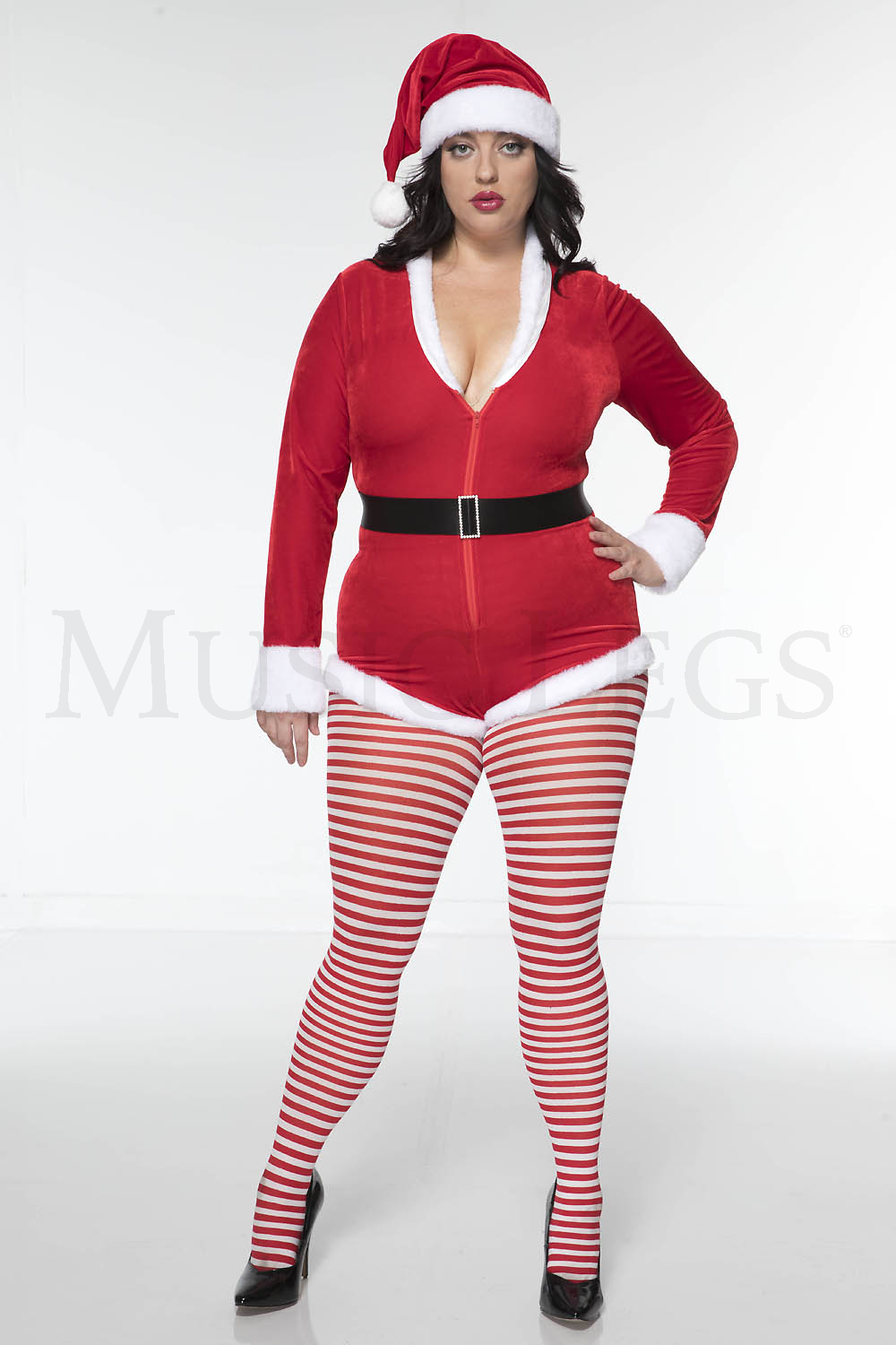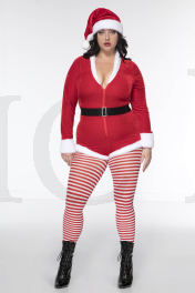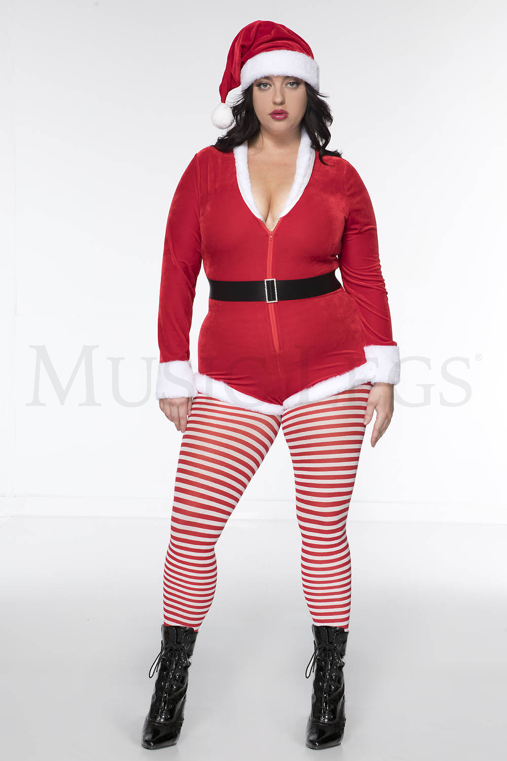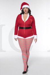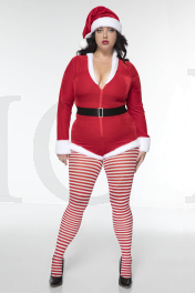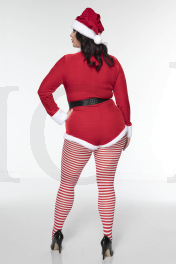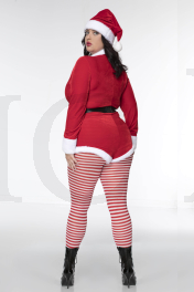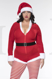 3 PC. includes: Plus size velvet zip up romper with faux fur trim, matching hat, and velcro closure belt