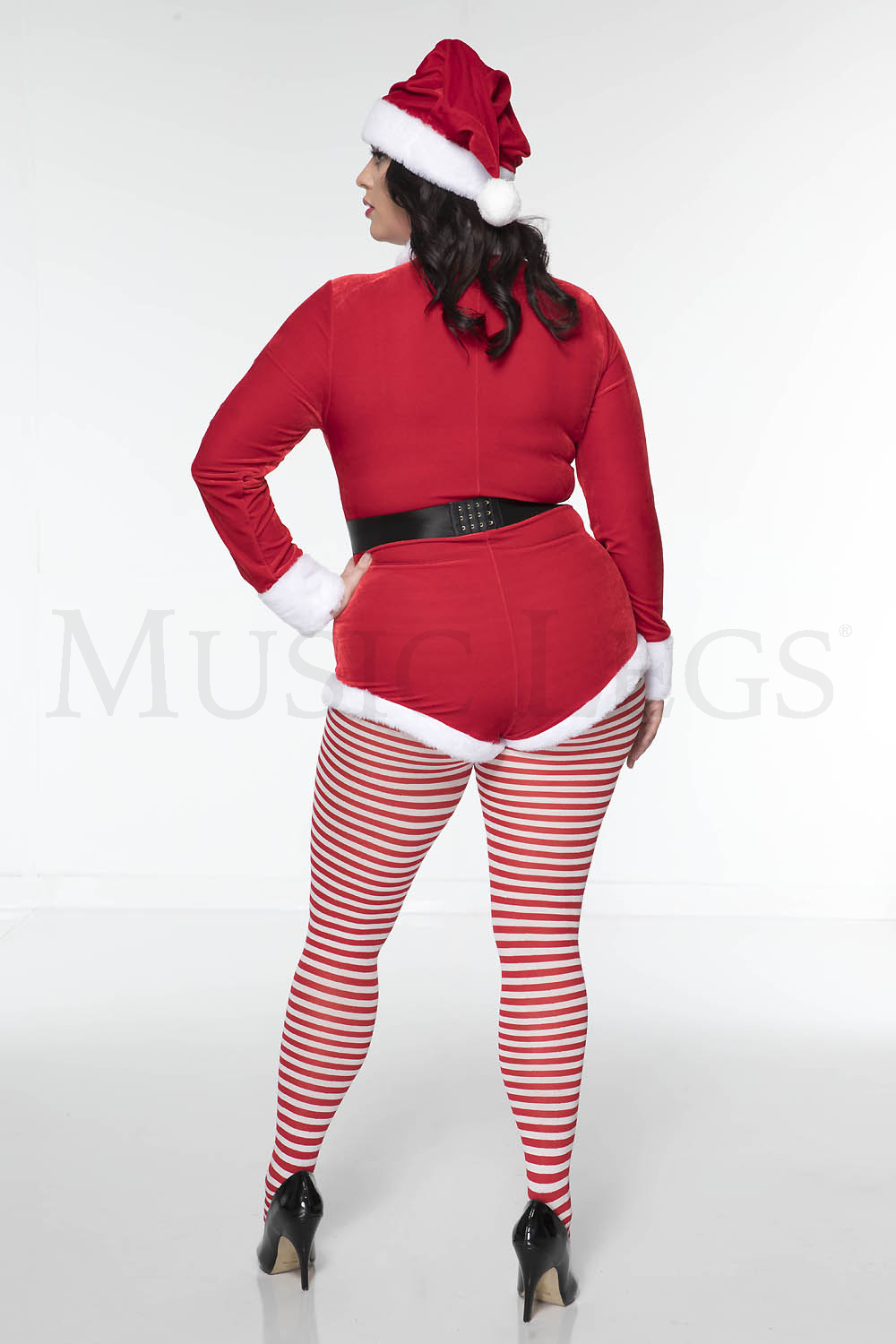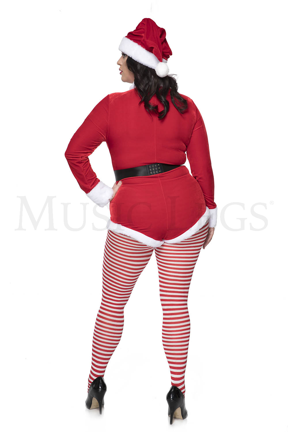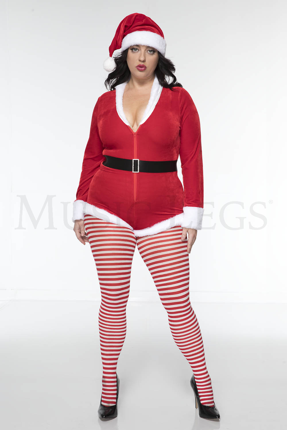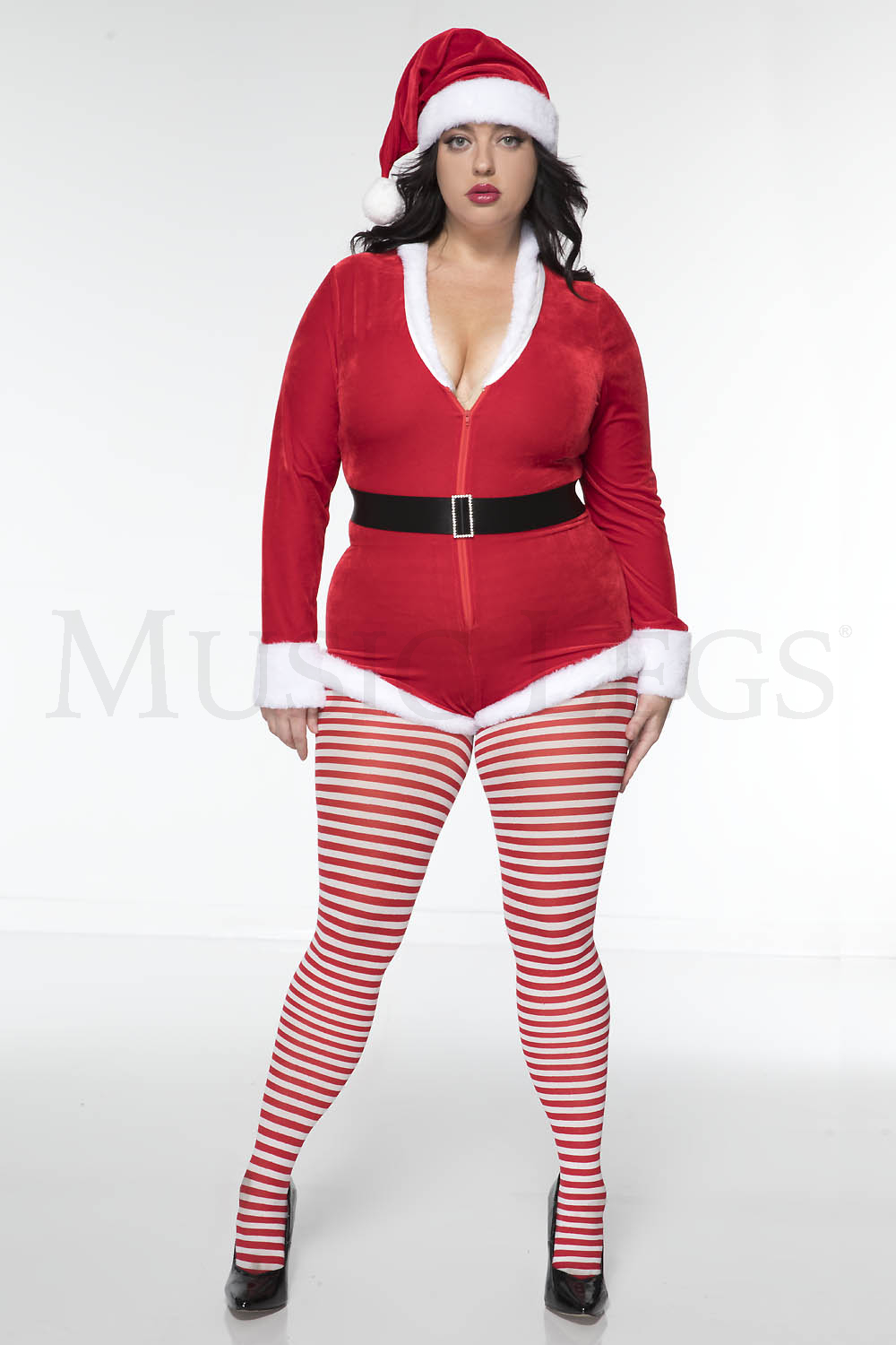 3 PC. includes: Plus size velvet zip up romper with faux fur trim, matching hat, and velcro closure belt