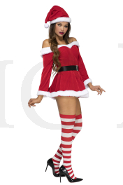 3 PC. includes: Off the shoulder velvet dress with adjustable straps, hat, and belt with faux rhinestone buckle