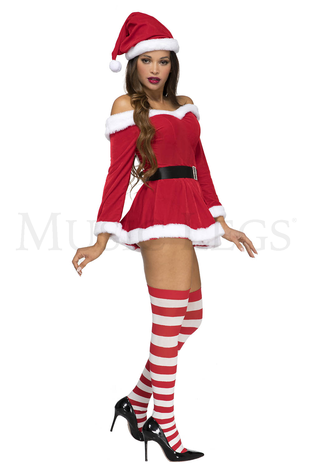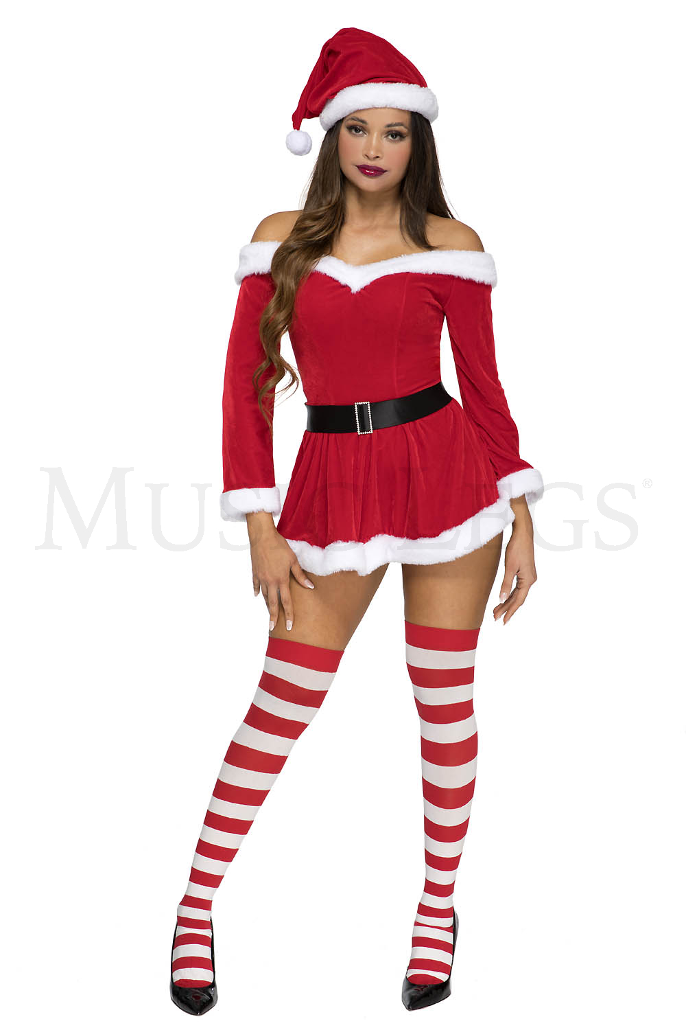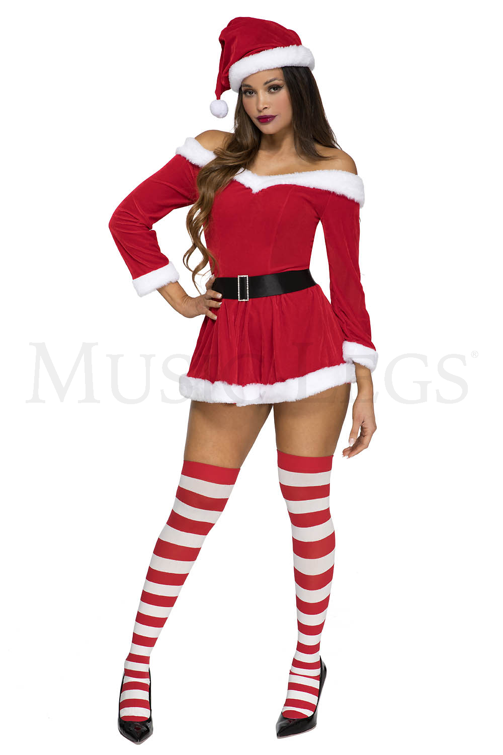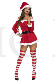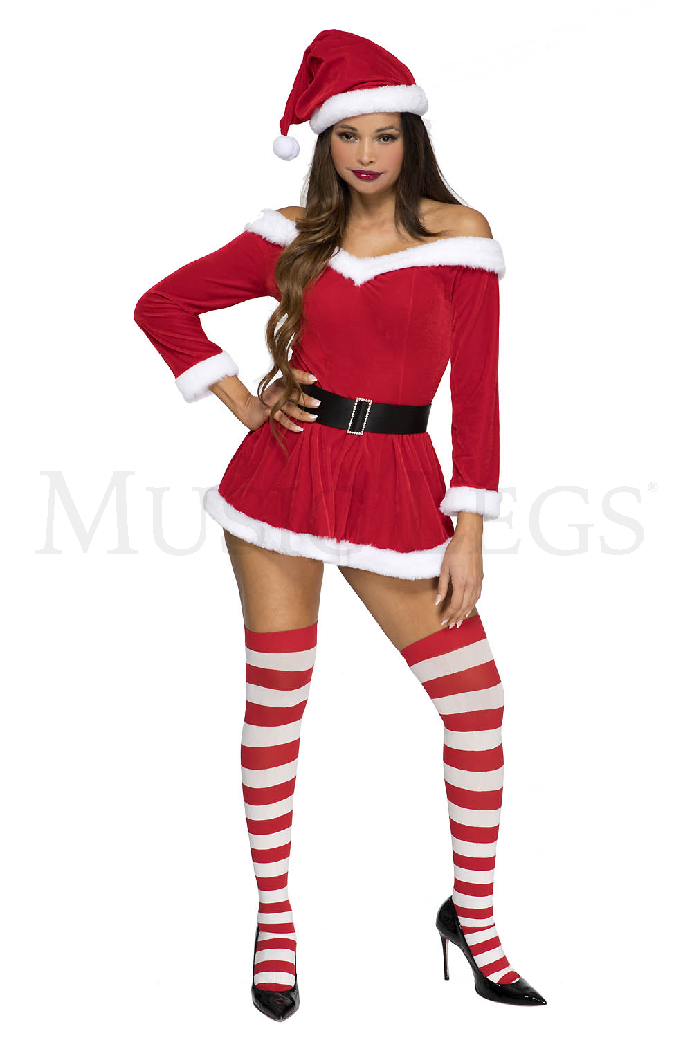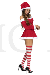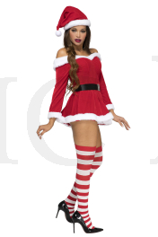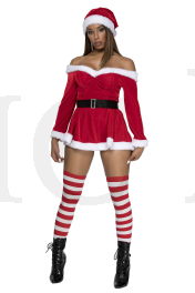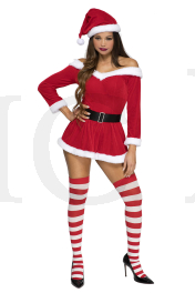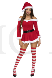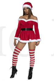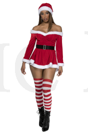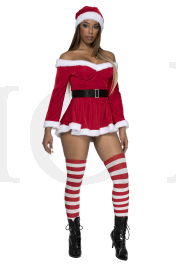 3 PC. includes: Off the shoulder velvet dress with adjustable straps, hat, and belt with faux rhinestone buckle