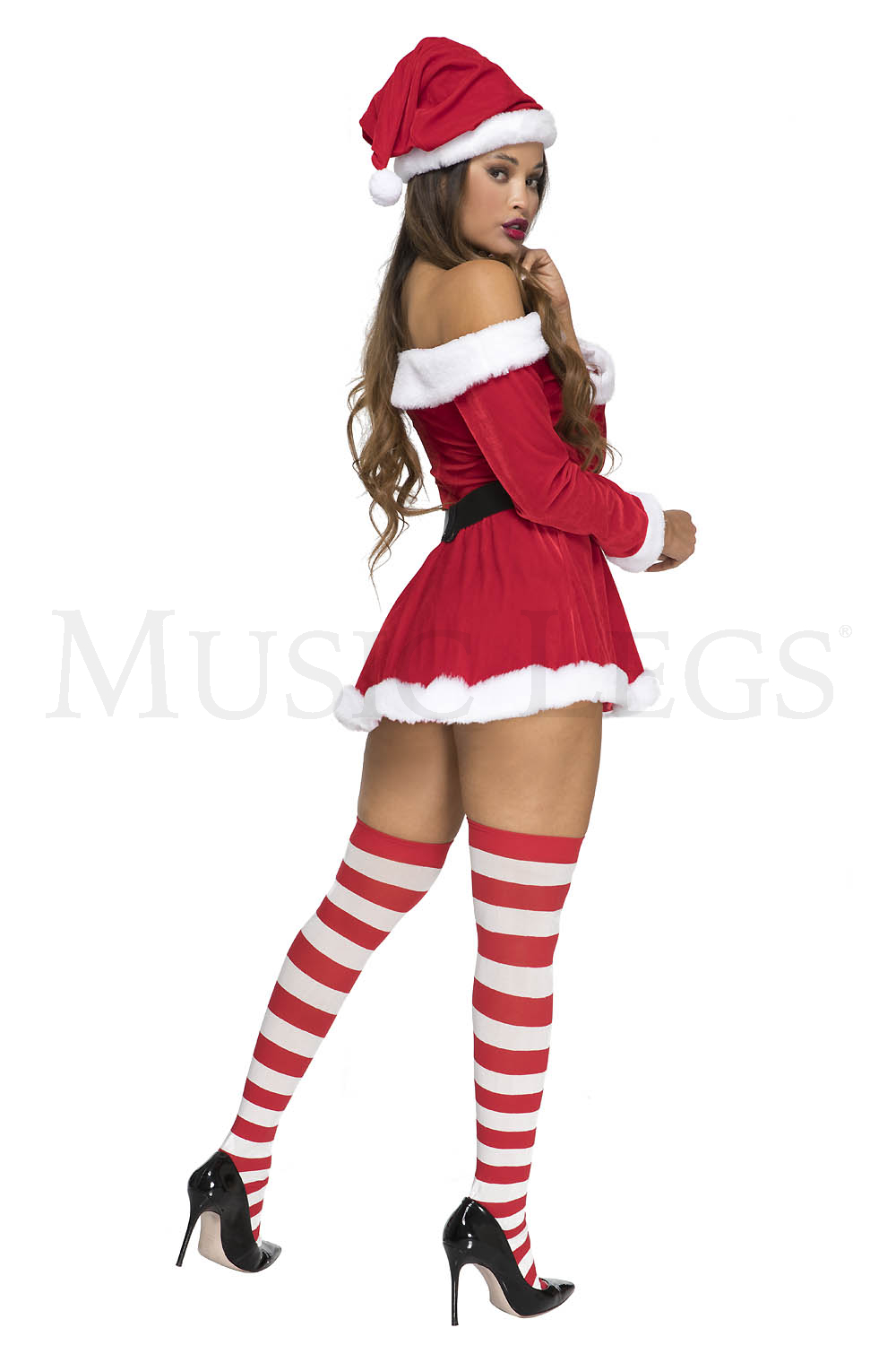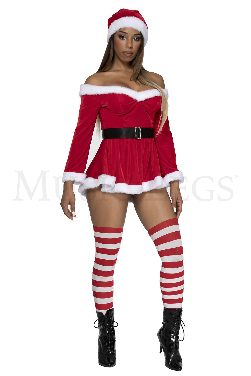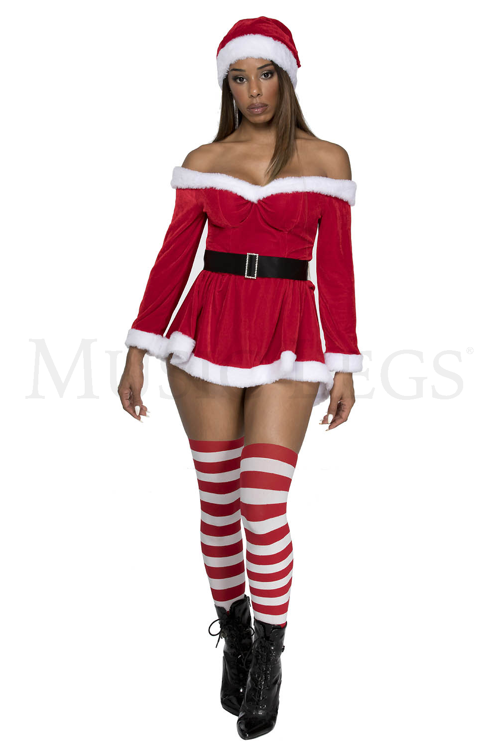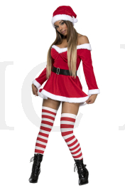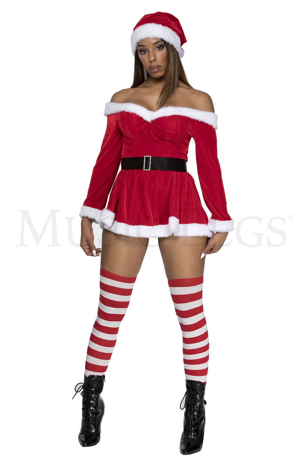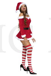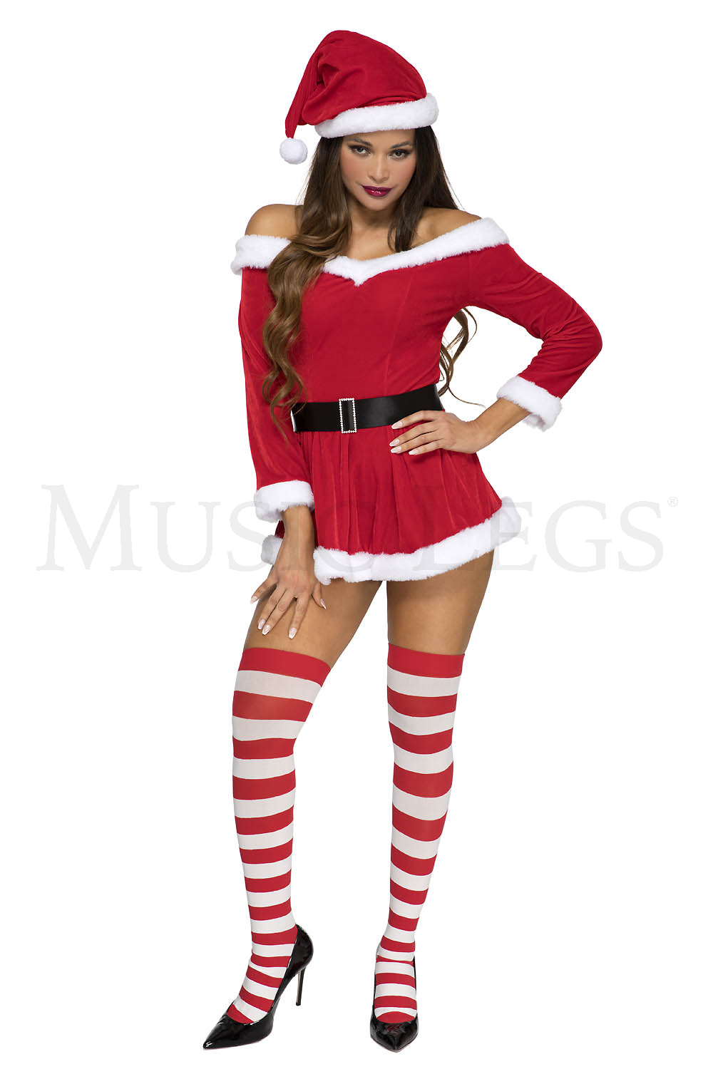3 PC. includes: Off the shoulder velvet dress with adjustable straps, hat, and belt with faux rhinestone buckle