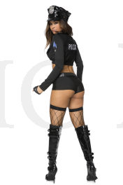 7 PC. includes: Zip up collar crop top with badge accents, shorts, belt, police hat, gloves, baton with attached hand cuffs