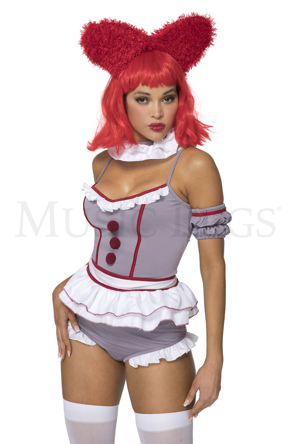 4 PC. includes: Gray dress with white rufe trims, romper, armbands, headband, and choker