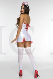 3 PC. includes: Wet look front and back lace up details dress with built in apron, sthethoscope, and headband