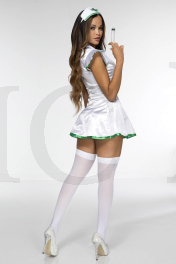 3 PC. includes: Button up and A-line skirt dress with front pockets, headpiece, and shot needle