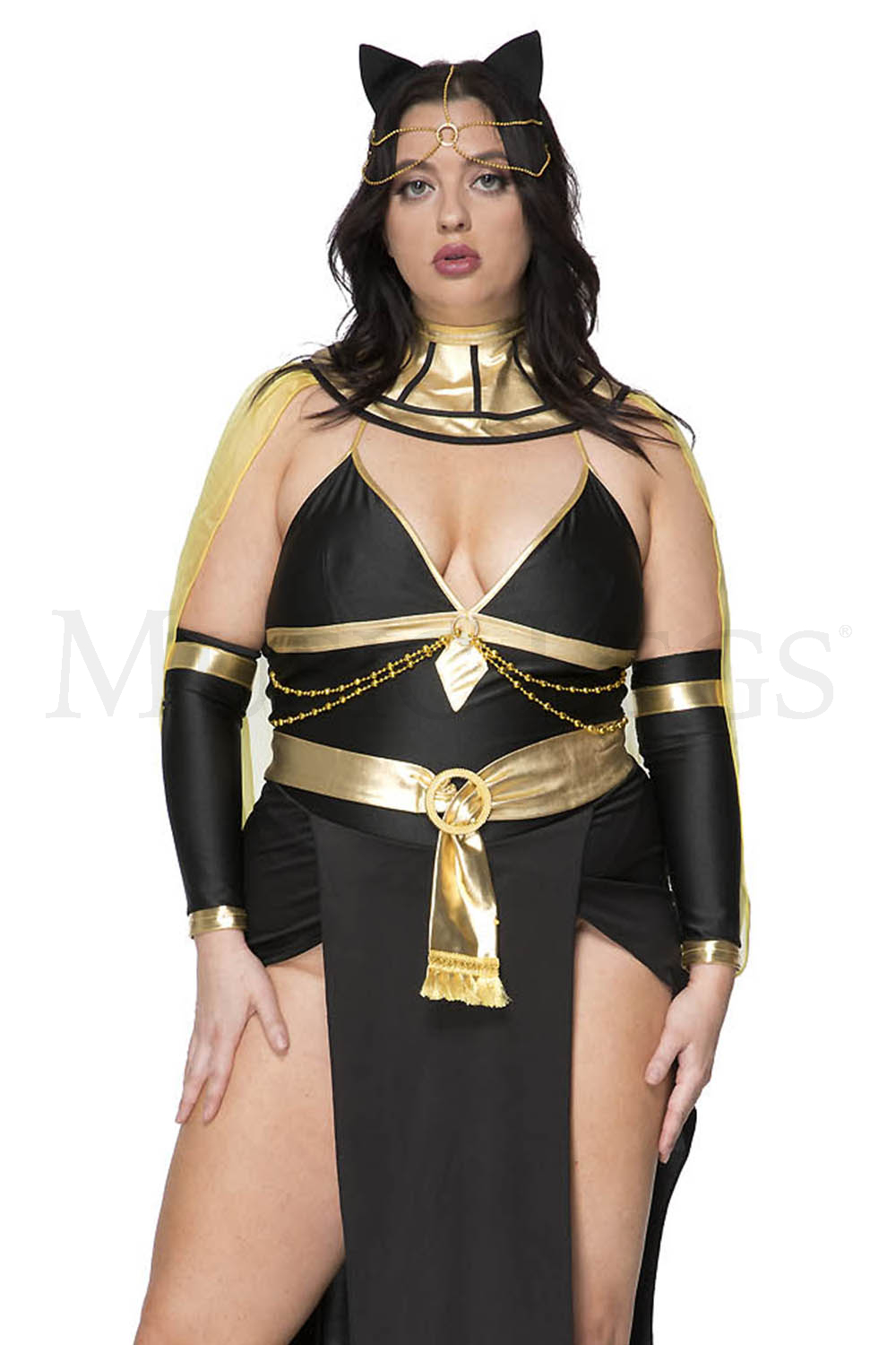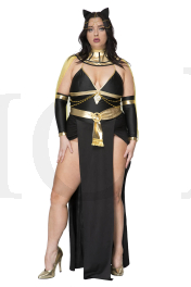 5 PC. includes: Plus size black sheer dress with side slit skirt and gold belt, armbands, head chain with ear, choker, and cape